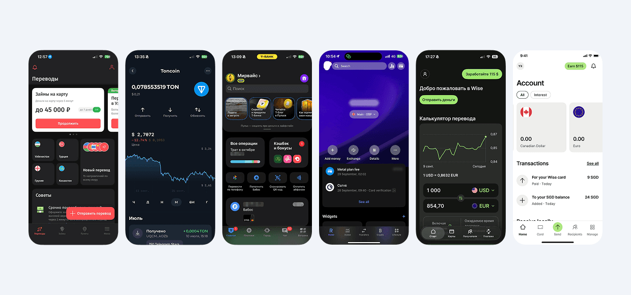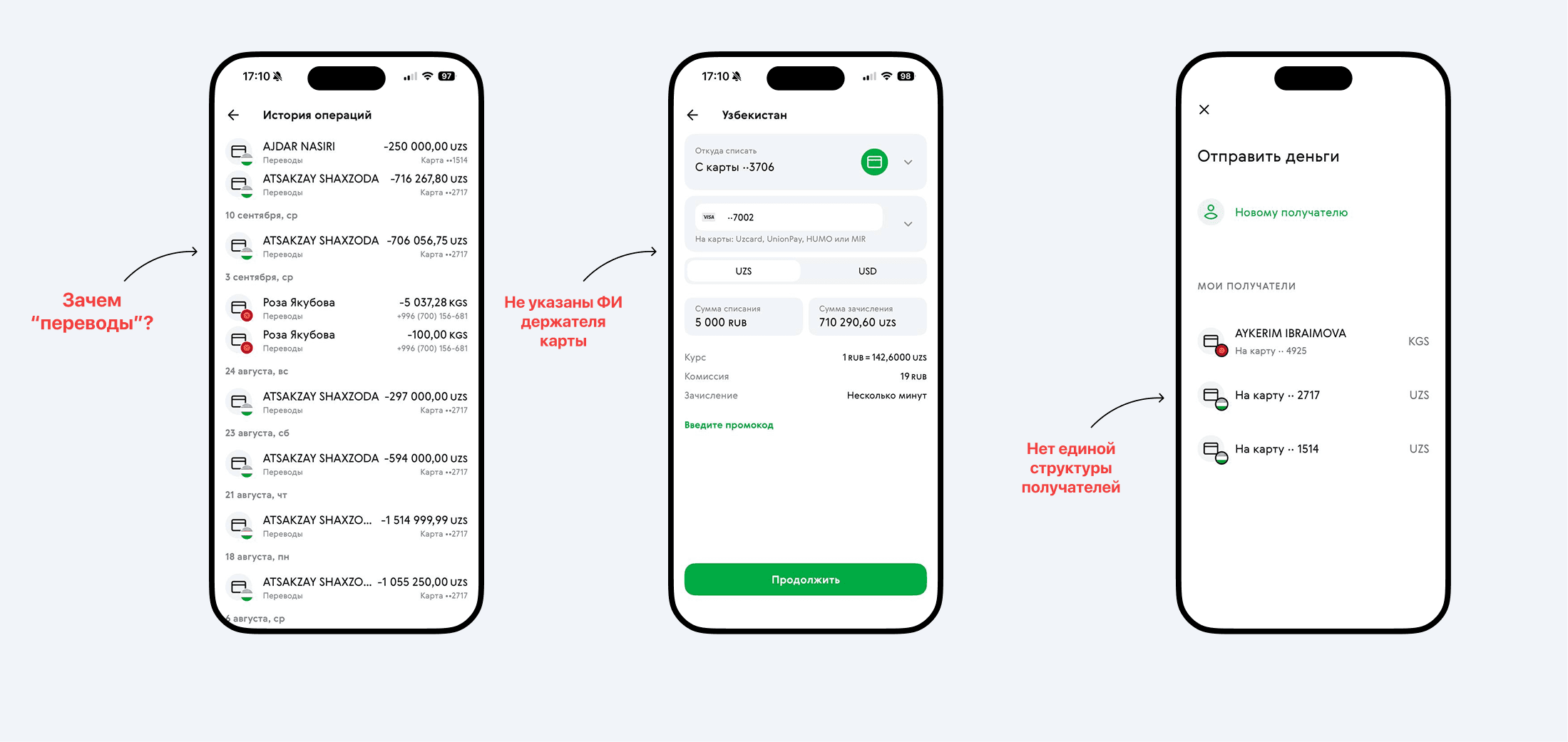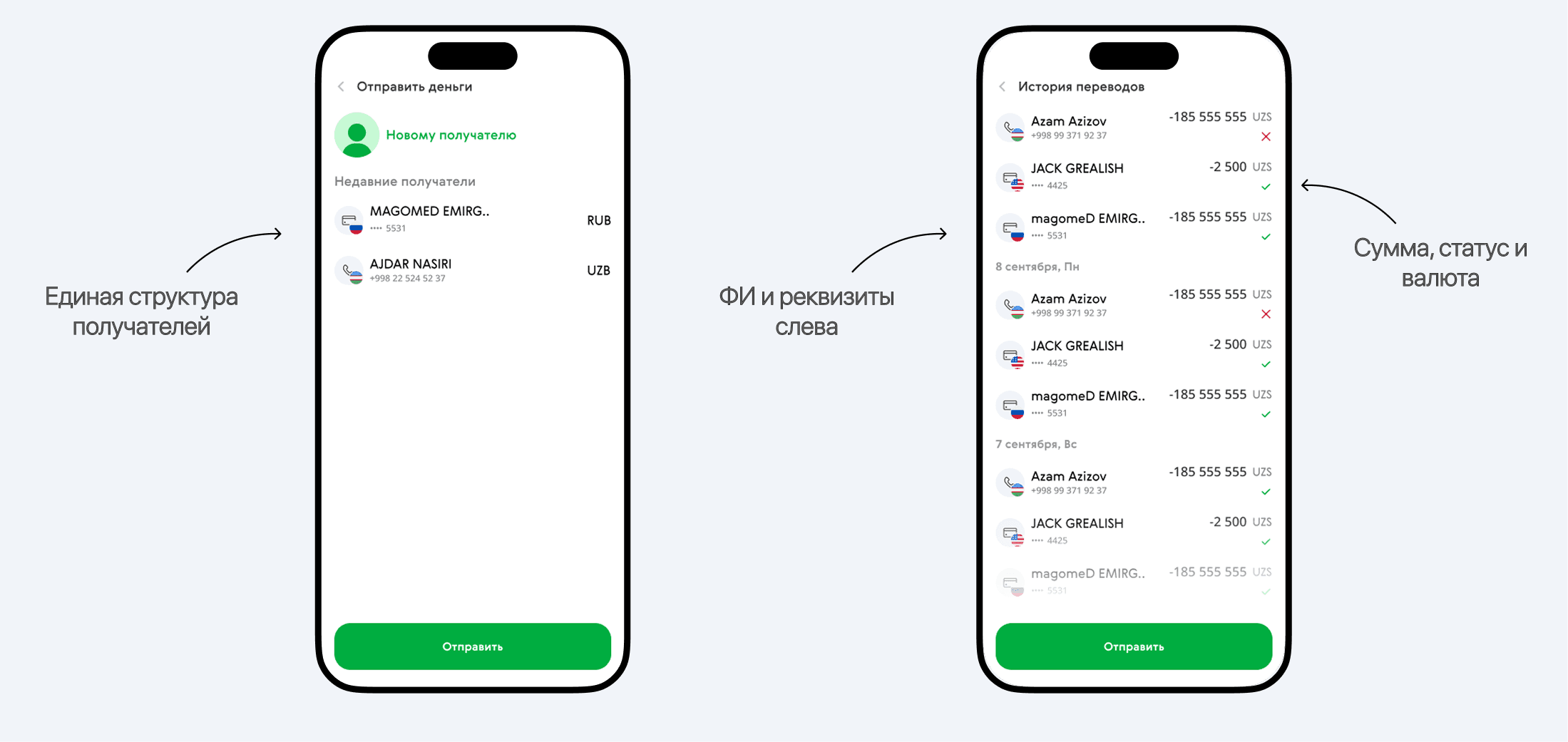 The recipient panels have a single data display style on the left: FI and details. In addition, the user can now see which transfer has which status. For convenience, the number and currency are separated, so as not to make sense of each element (numbers separately, currency separately, but in 1 group).