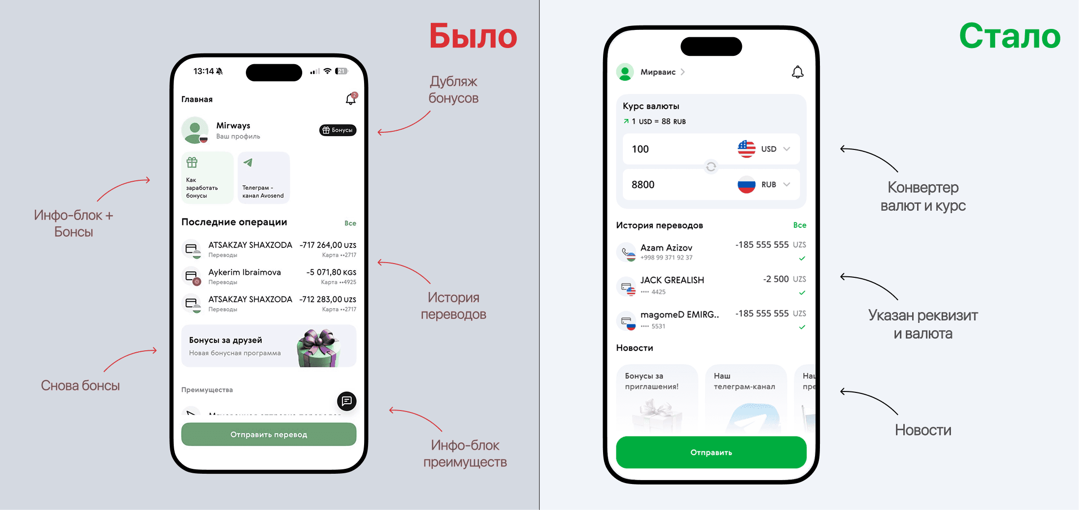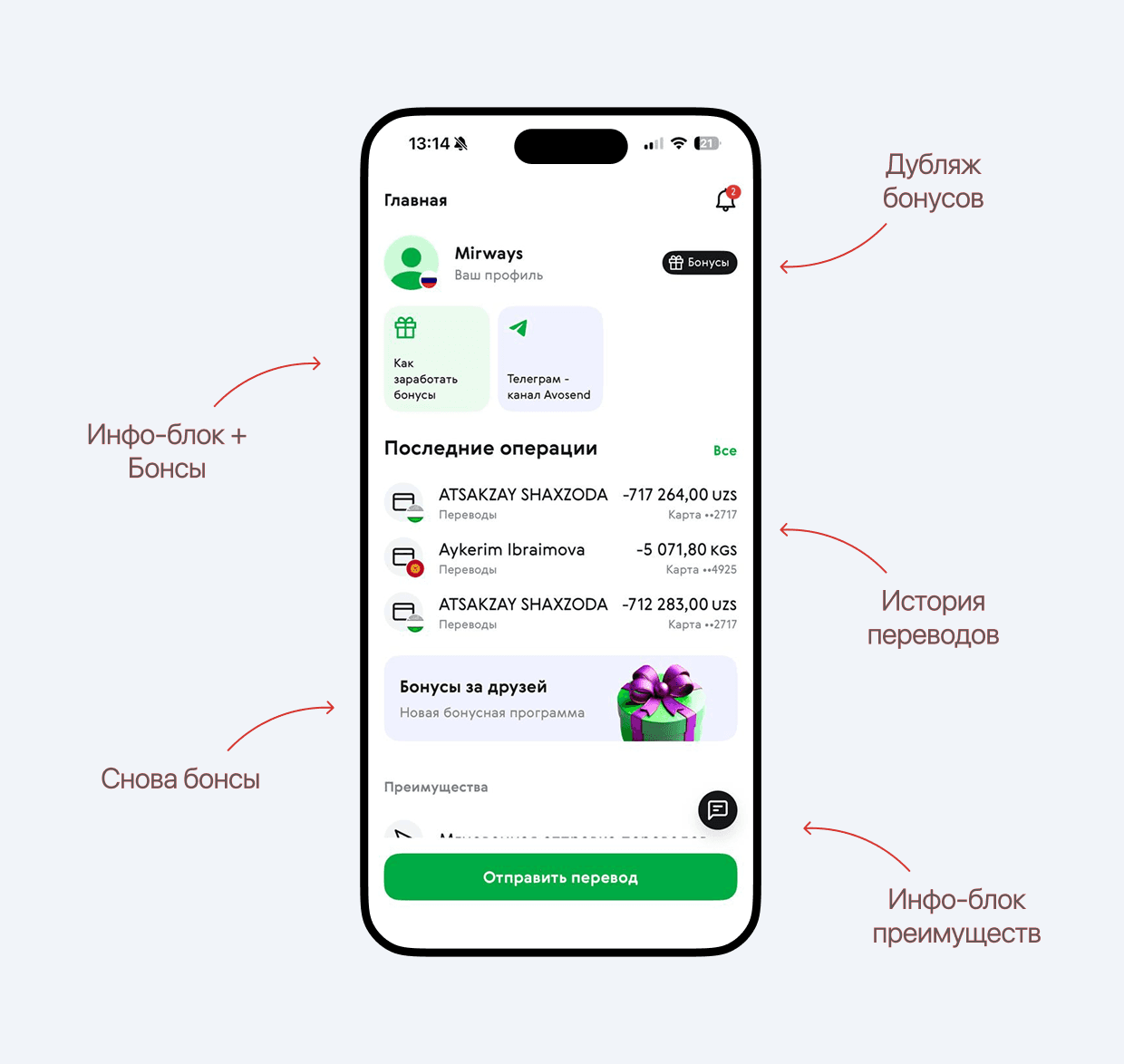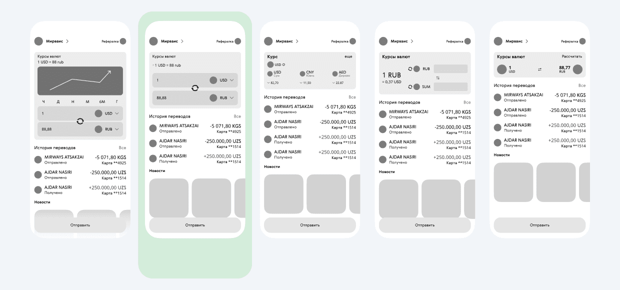 Based on an analysis of the main application screens and a survey of 30 people (foreigners in the Russian Federation who transfer money to their country), I identified a function that would be useful and developed a prototype.