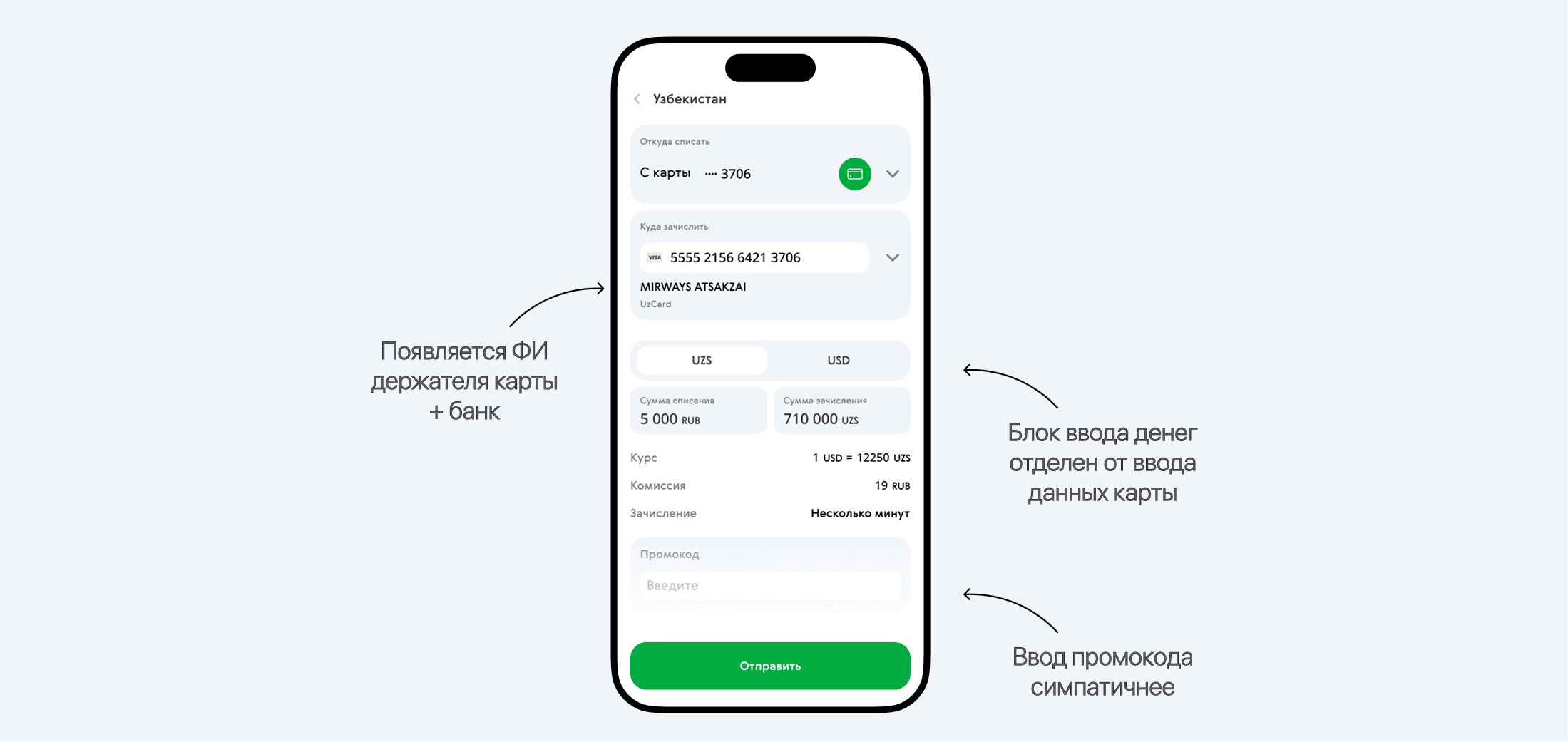 The interval between the card entry block and the transfer amount has been increased, the promo code entry field has been grouped by meaning and changed (people almost do not use promo codes, but it does not hurt to make the design more aesthetically pleasing and in a uniform style)