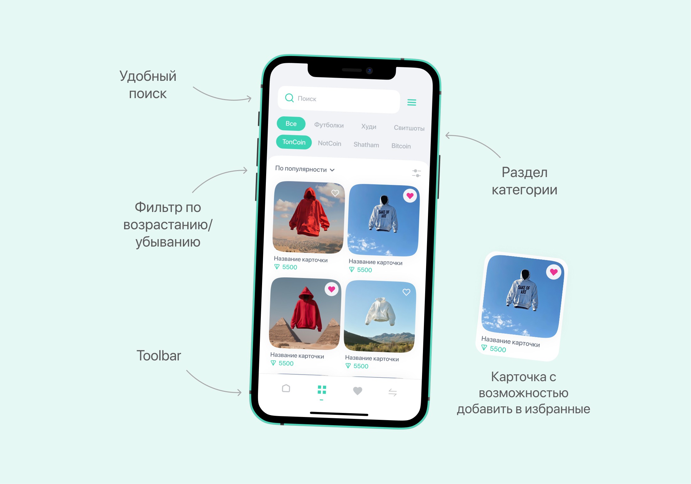 В обычных маркетплейсах использовалась удобная UX-практика - категории и бренды в виде слайдера. Такой подход я взял на мужко и предложил его в качестве основного варианта поиска NFT-товара внутри приложения CryptoMerchStore. А ниже уже в поиске подробная фильтрация по цене, размеру и цвету.