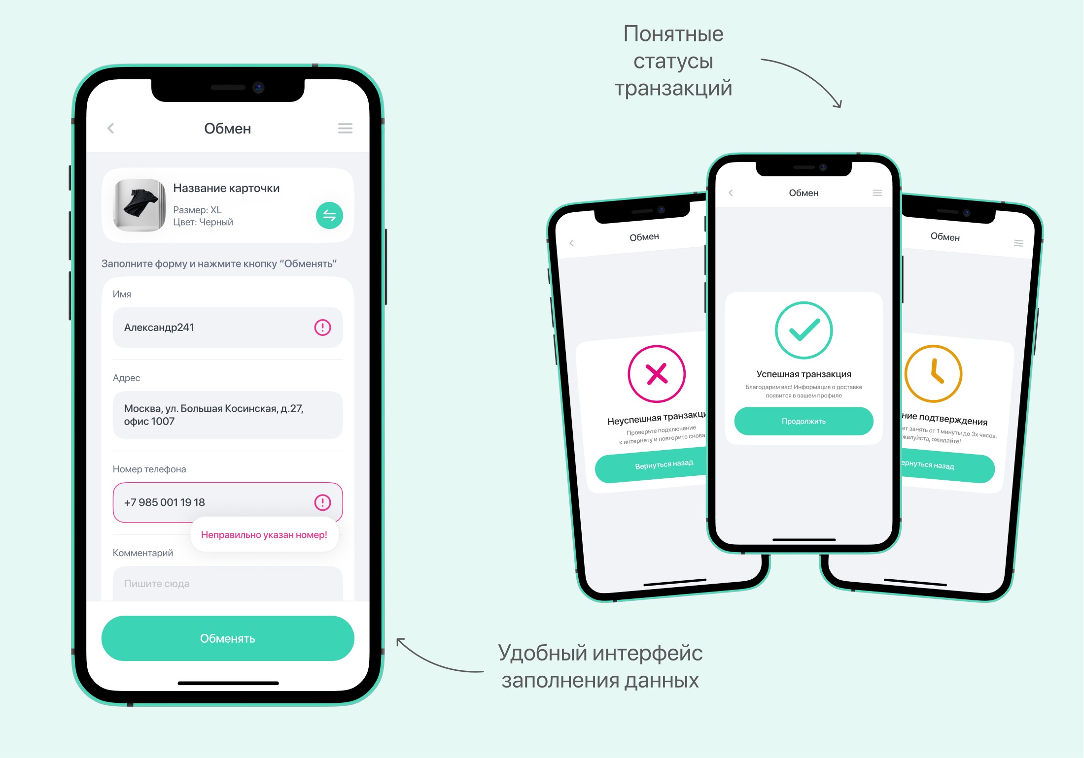 Пользователей важно не загружать полями заполнения данных и грамотно показать правильность заполнения. Если пользователь ошибся, то сразу понимает, где допустил ошибку в полях. Также отработал экраны статуса транзакций. Они показываются только после перехода на Getgems и обратно.