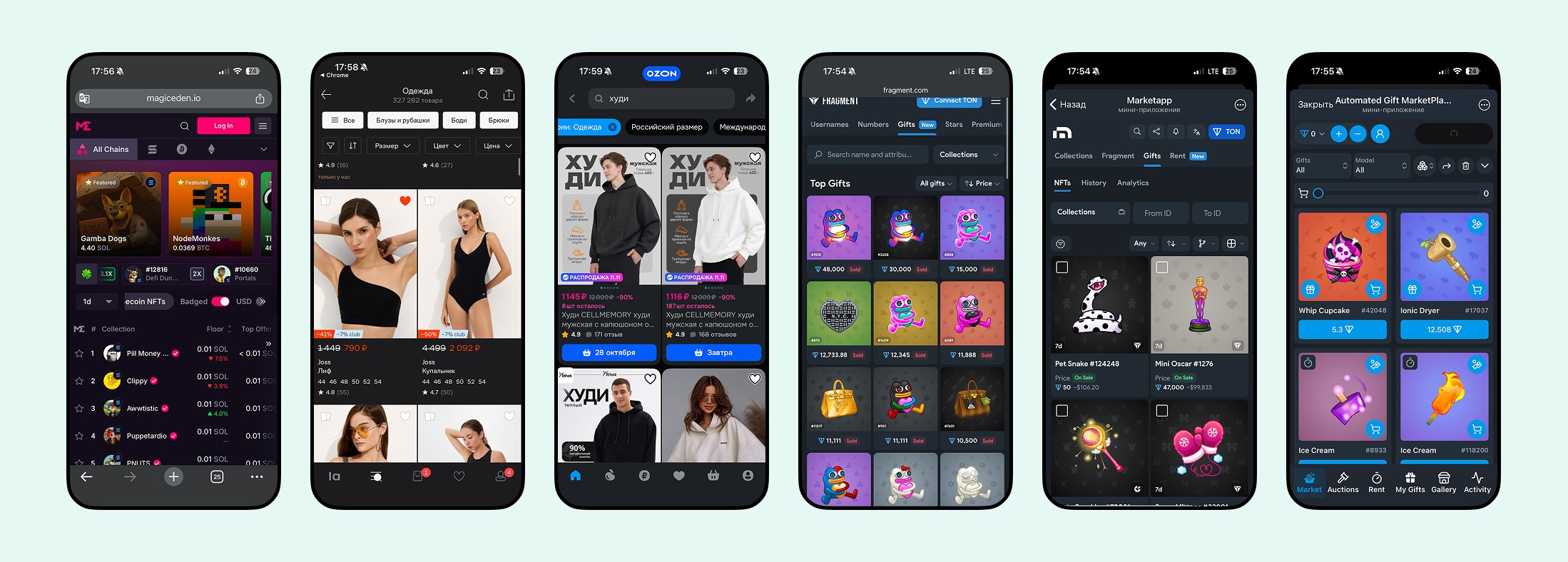 Я изучил смежные приложения , которые были ориентированы на продажу NFT и не только: Fragment, Tonnel, Getgems, OpenSea, OZON, Wildberries